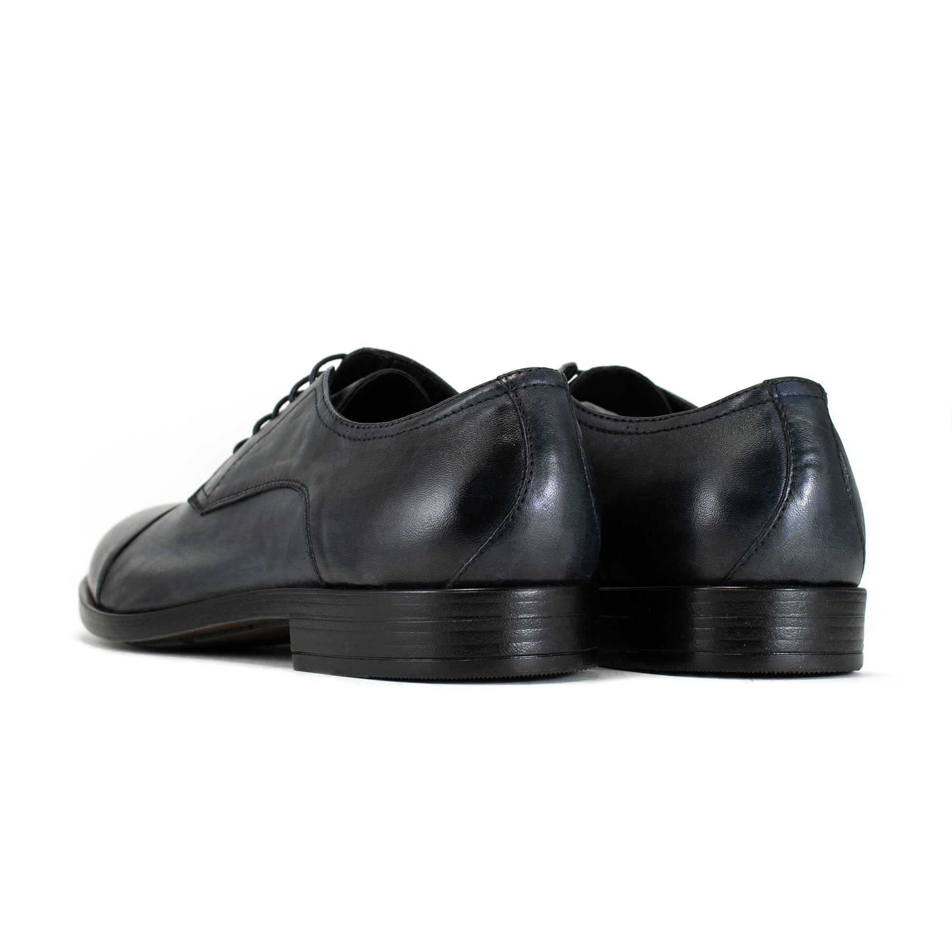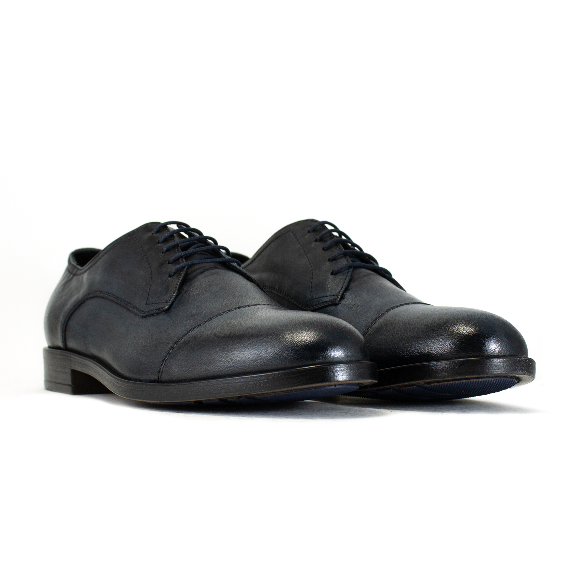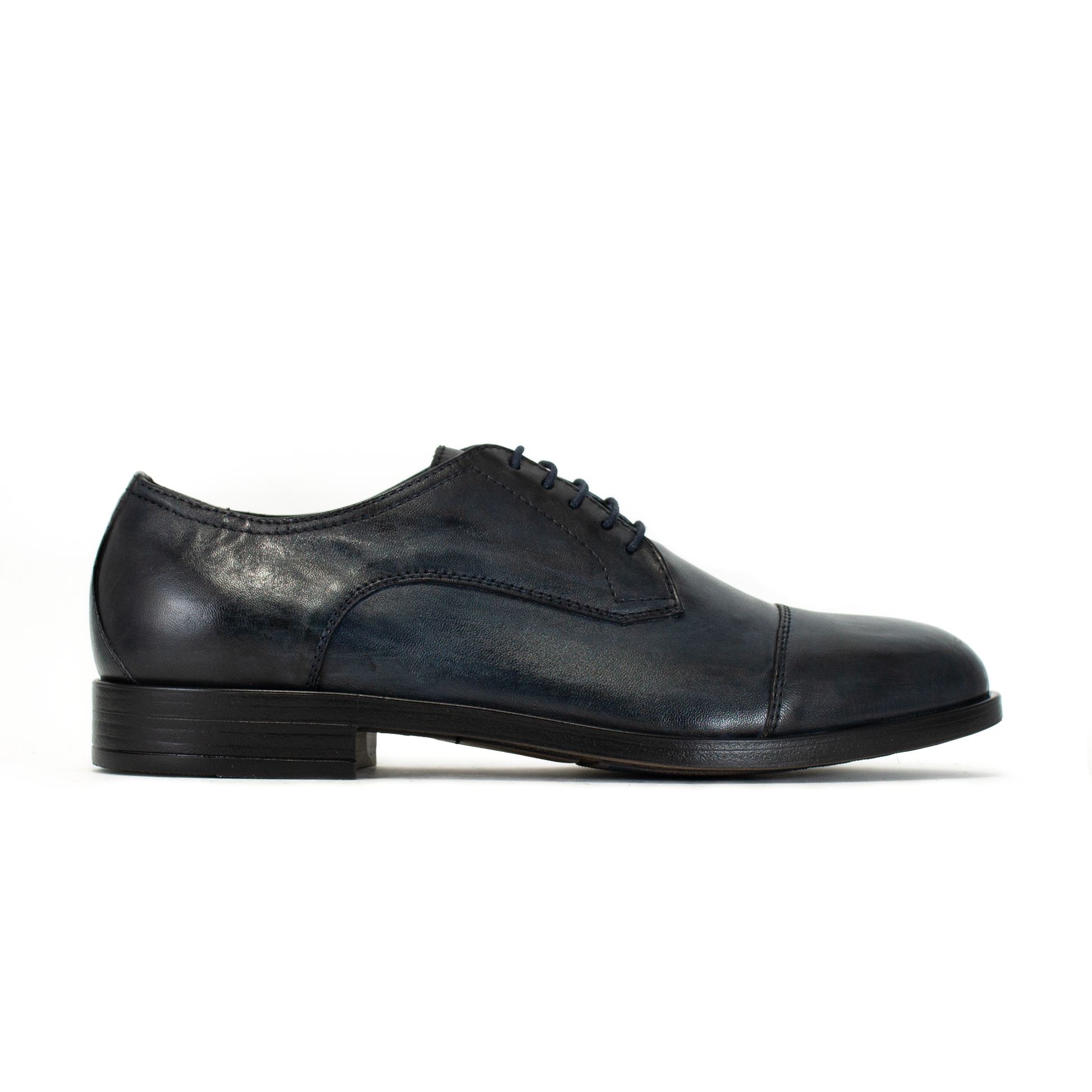La tomaia è realizzata in pelle blu selezionata per la sua flessibilità, riducendo i tempi di adattamento della scarpa al piede. Design pulito con mascherina cucita sotto i gambini, perfetto per contesti business, cerimonie o divise formali. A differenza del cuoio tradizionale, la suola in gomma offre maggiore grip, isolamento termico e un'ammortizzazione superiore.