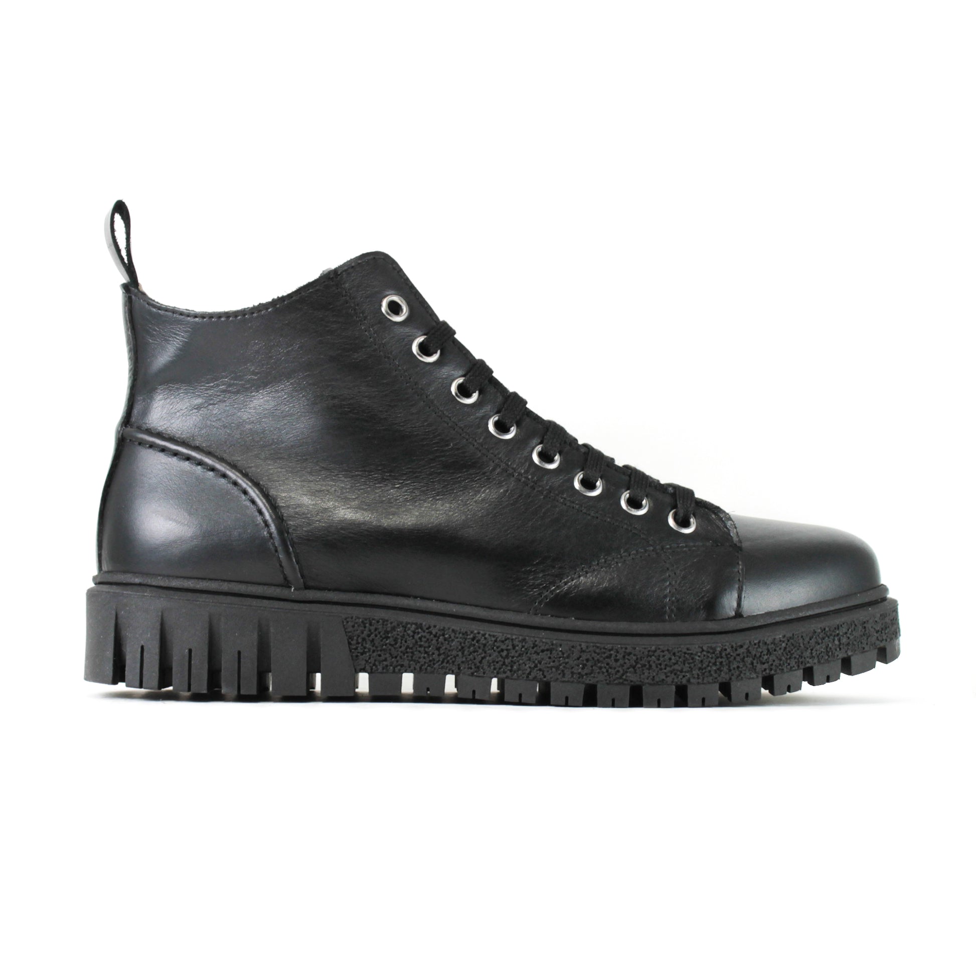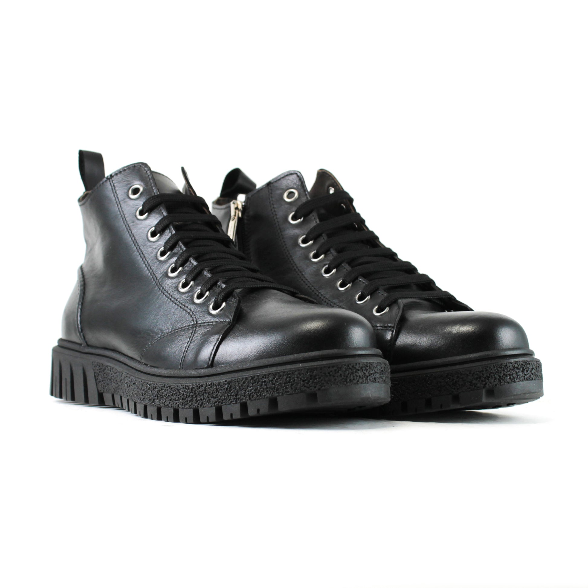 La cerniera sulla parte interna è l'elemento chiave per la comodità: una volta regolati i lacci, puoi calzare e sfilare il polacchino in un attimo, senza dover allacciare ogni volta. La tomaia in pelle nera offre una finitura ricca e morbida, emblema dell'eccellenza Made in Italy. La suola robusta carrarmato è studiata per garantire ammortizzazione, isolamento e stabilità, rendendolo perfetto per l'uso prolungato.