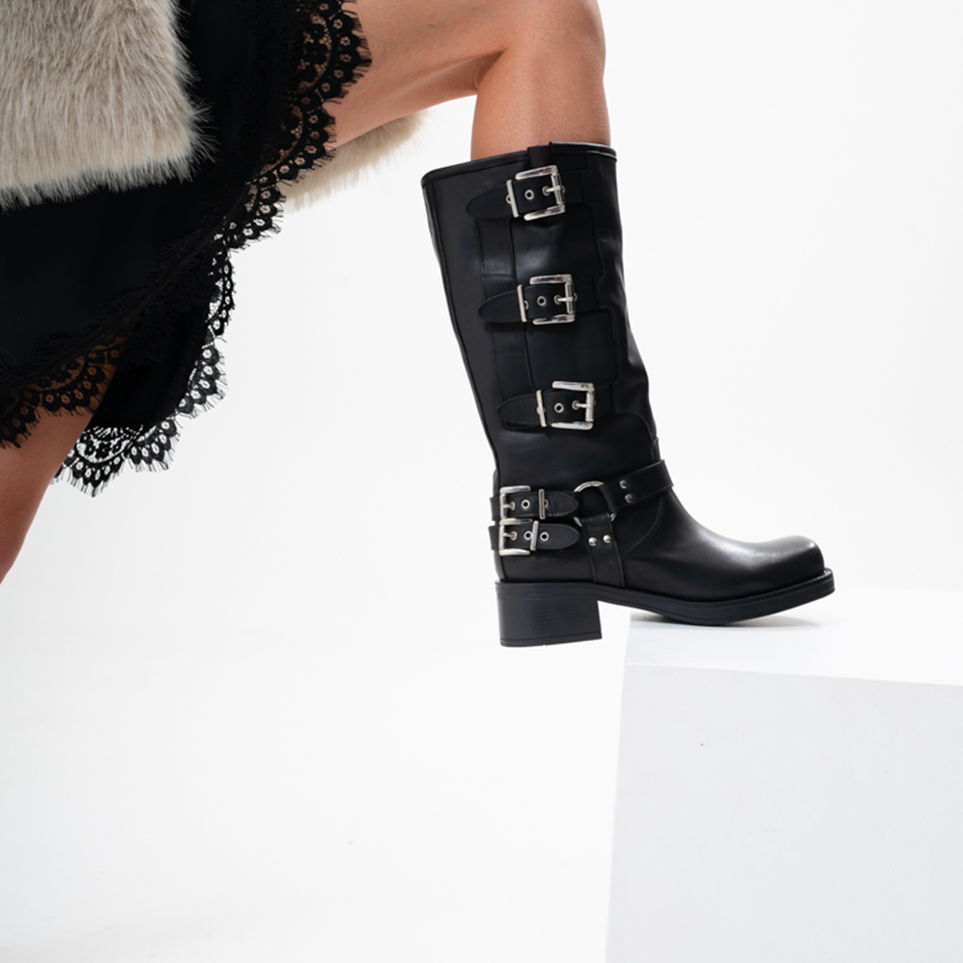 Stivale frye, biker sopra il polpaccio in vitello morbido, punta squadrata e accessori bold argento. Le tre fibbie regolabili laterali donano un effetto ancora più rock.