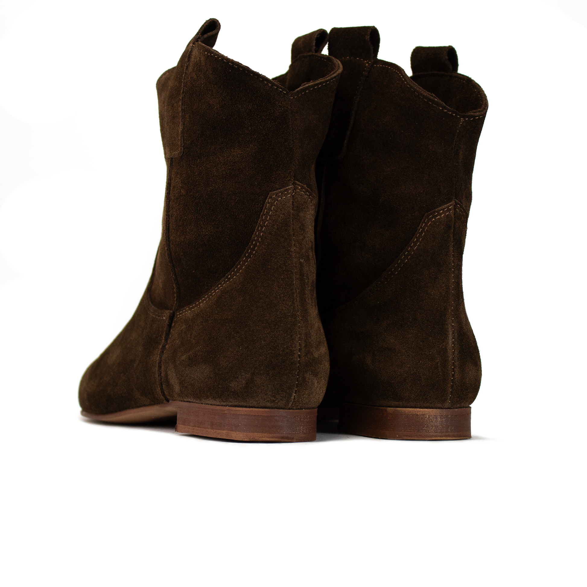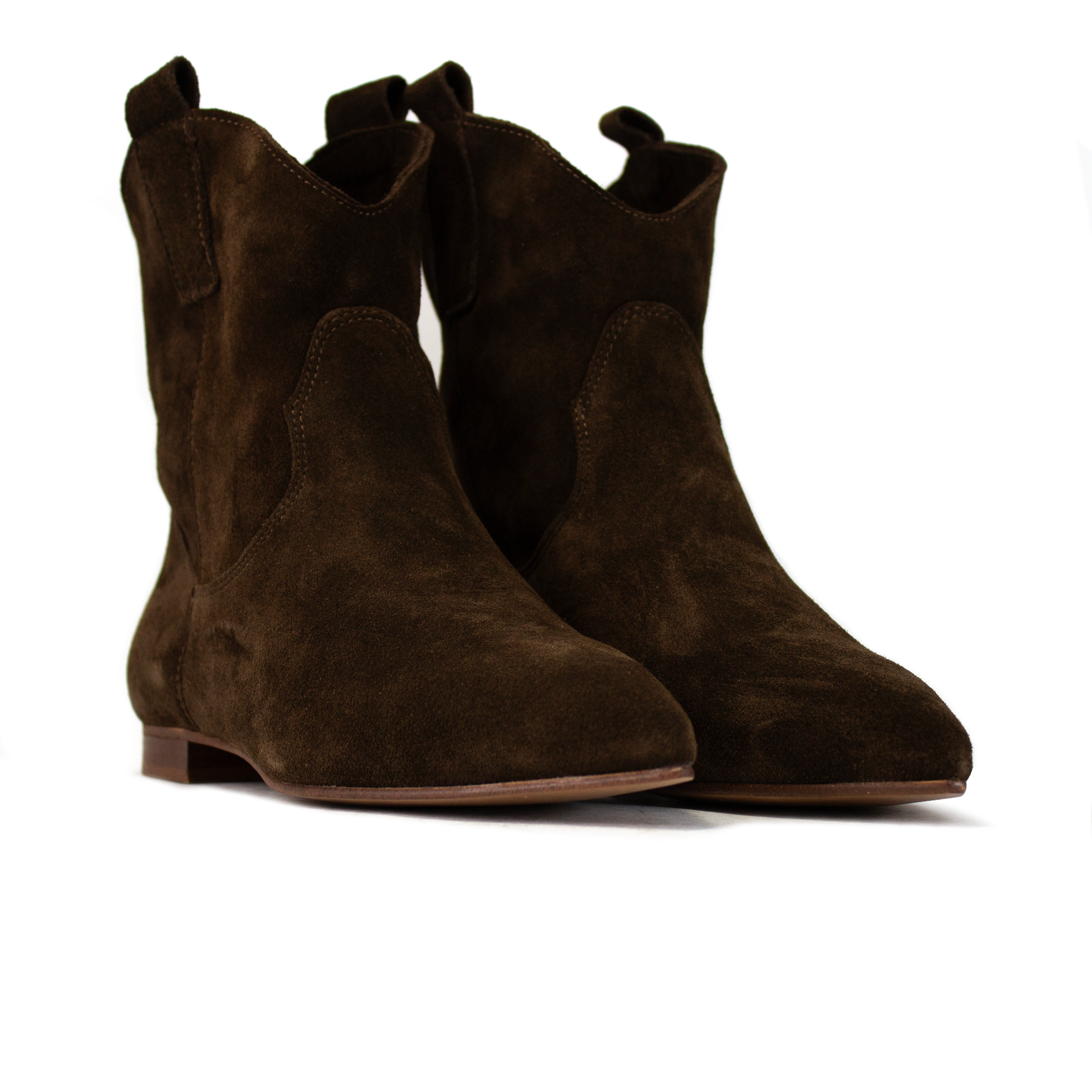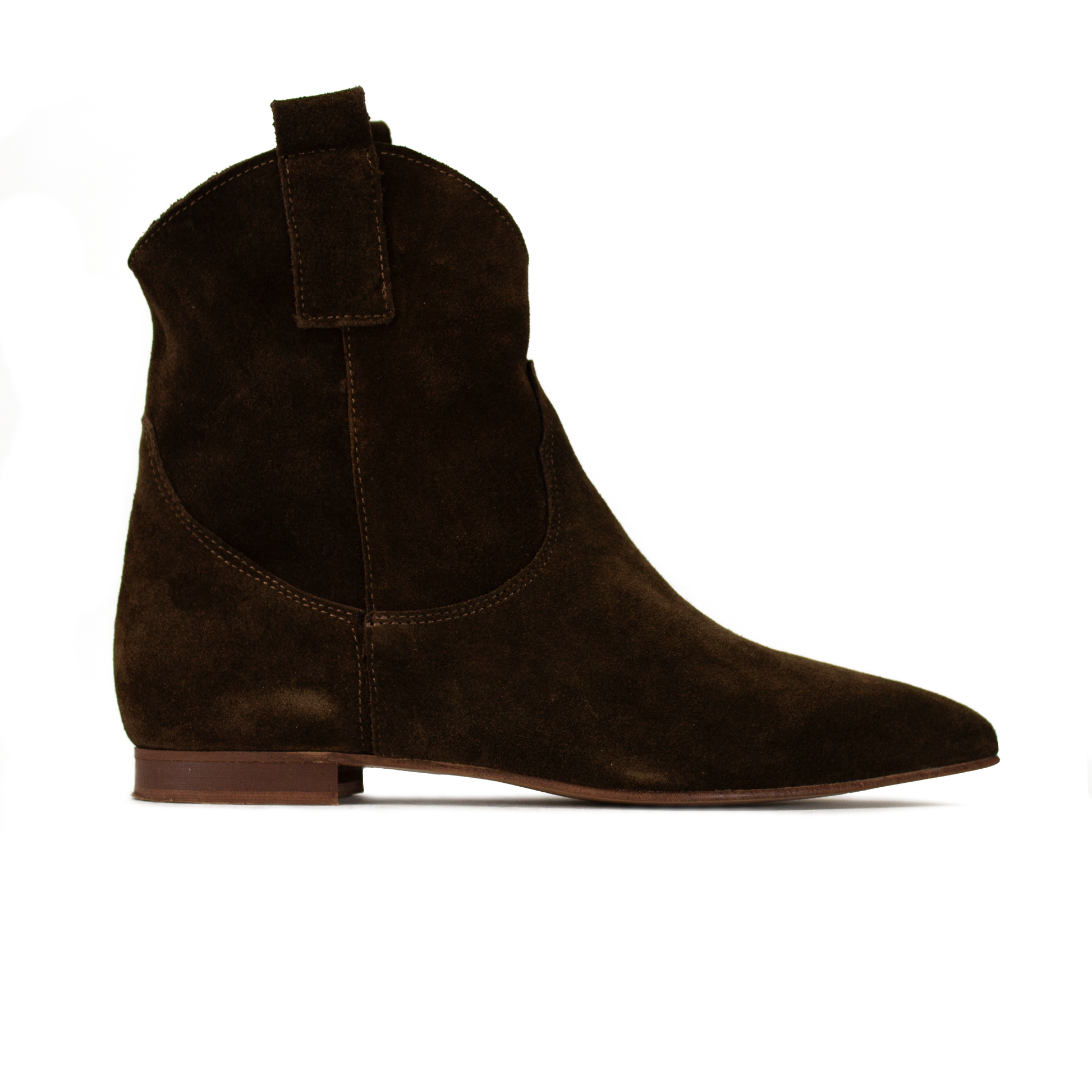 Il fascino del West incontra l'eleganza urbana in questo stivaletto texano basso. Realizzato in una pregiata pelle scamosciata testa di moro, questo modello reinterpreta il classico camperos in una chiave più sobria e versatile, perfetta per chi ama lo stile texano ma preferisce la praticità di una suola ultra-flat. Selezioniamo solo pelle morbidissima che avvolge la caviglia senza costrizioni, garantendo una libertà di movimento totale. La silhouette a punta dona un carattere deciso e slancia la gamba, pur mantenendo il comfort di una calzata bassa. Il profilo superiore sagomato e le asole laterali richiamano l'estetica dei veri stivali da cowboy, rendendolo un pezzo iconico del guardaroba.