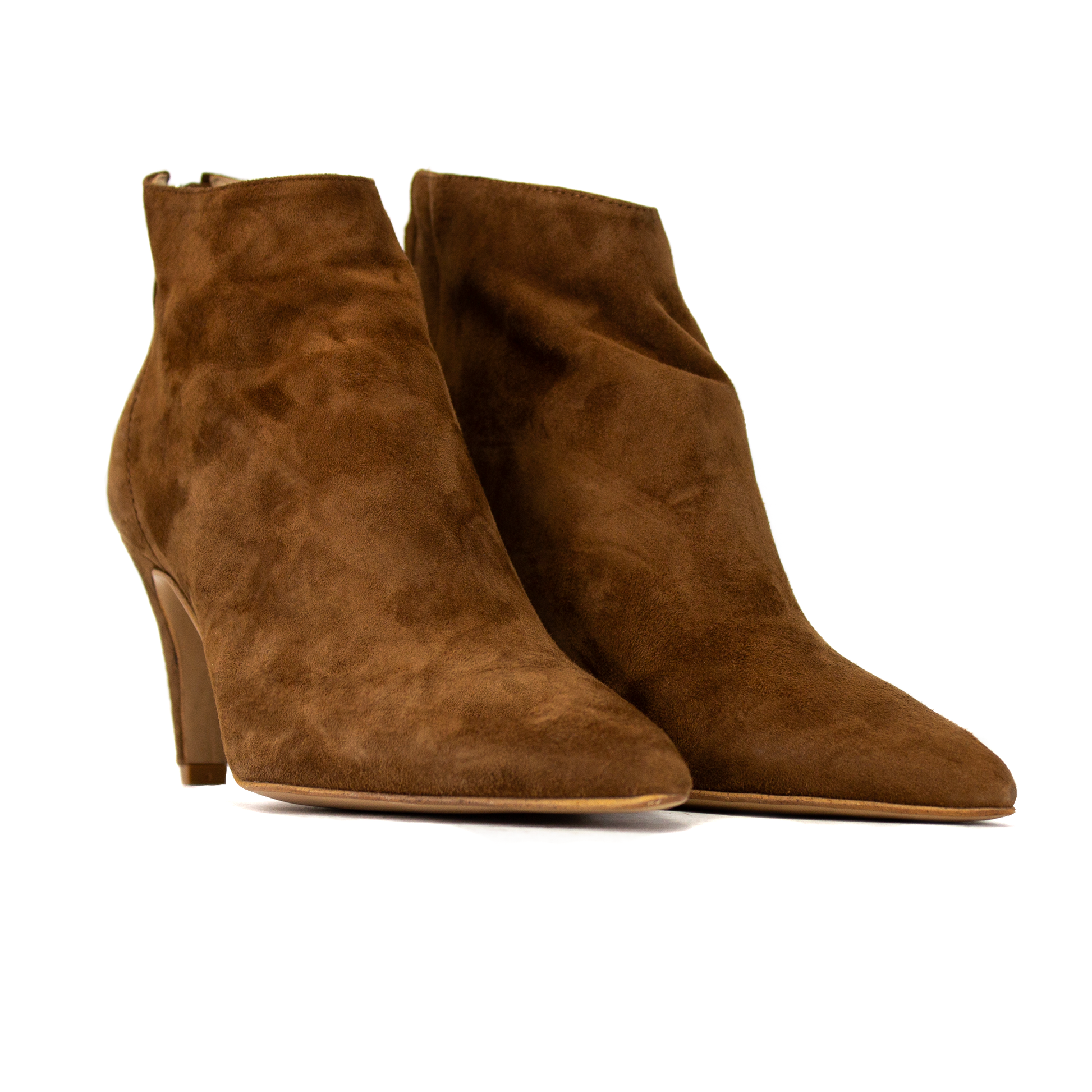 Sofisticato, sinuoso e incredibilmente leggero: lo stivaletto a punta è pensato per la donna che ricerca un'eleganza senza sforzo. La silhouette affilata e la finitura in pregiata pelle scamosciata color cuoio lo rendono un pezzo chiave per elevare qualsiasi outfit, dai look da ufficio alle serate più glamour.