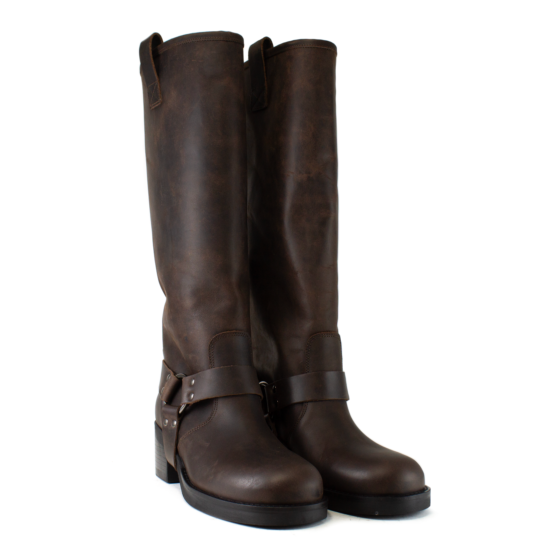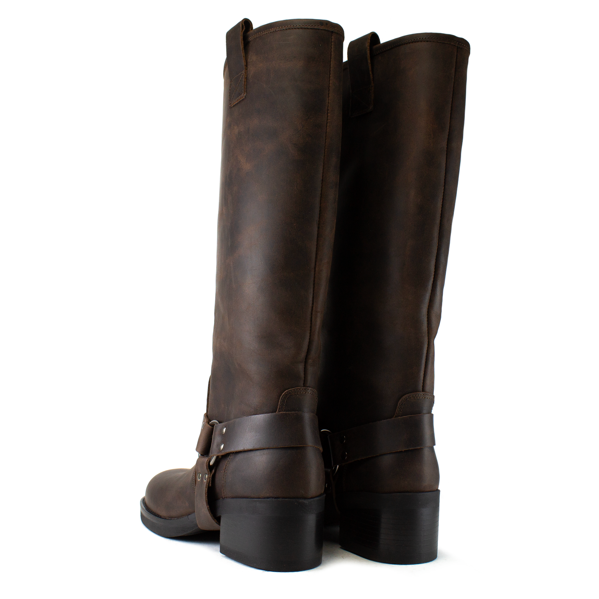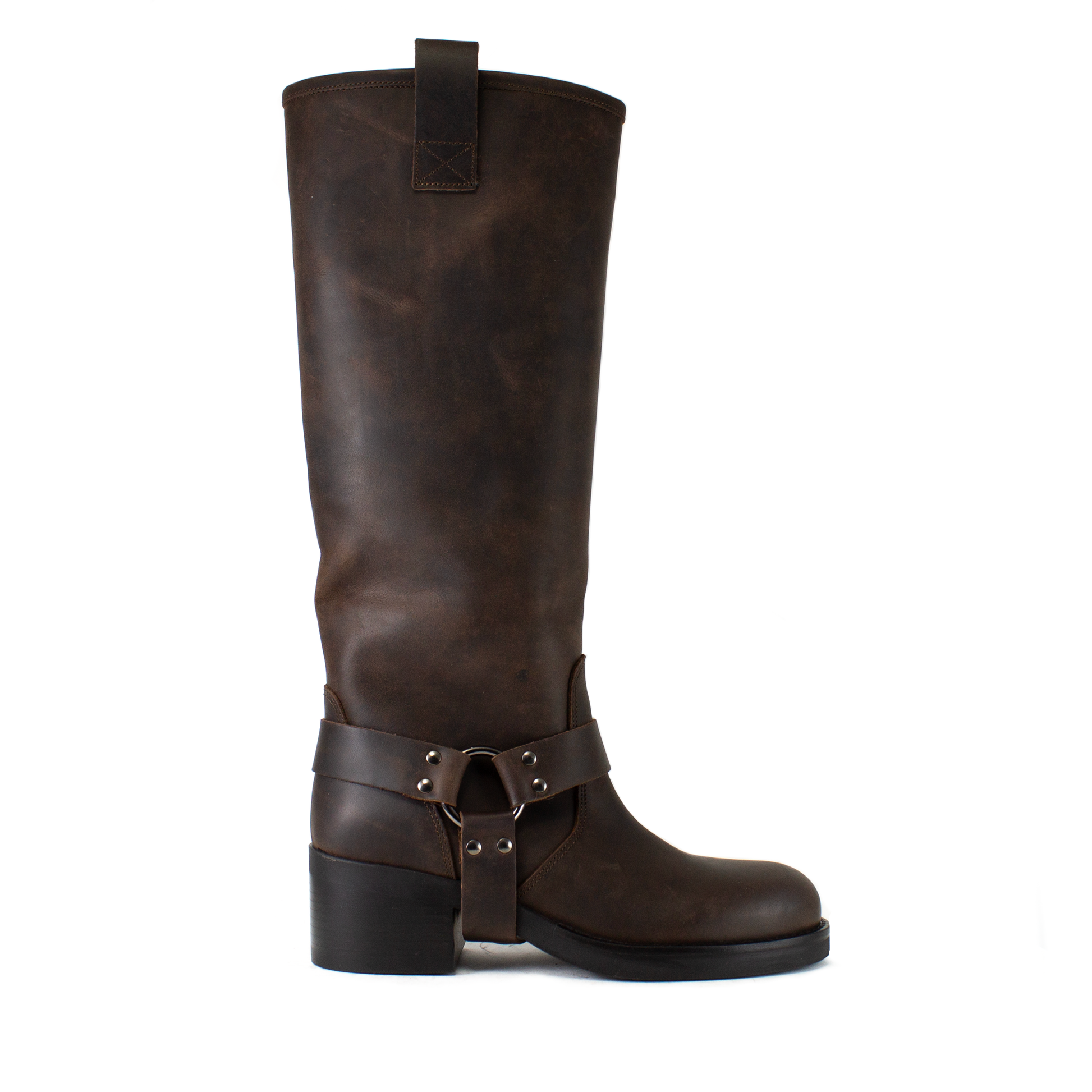 Stivale sotto al ginocchio morbido alla gamba, la pelle nappata testa di moro è spazzolata donando un effetto scuro e versatile. L'accessorio con anelli alla caviglia è estraibile con bottone nascosto.
