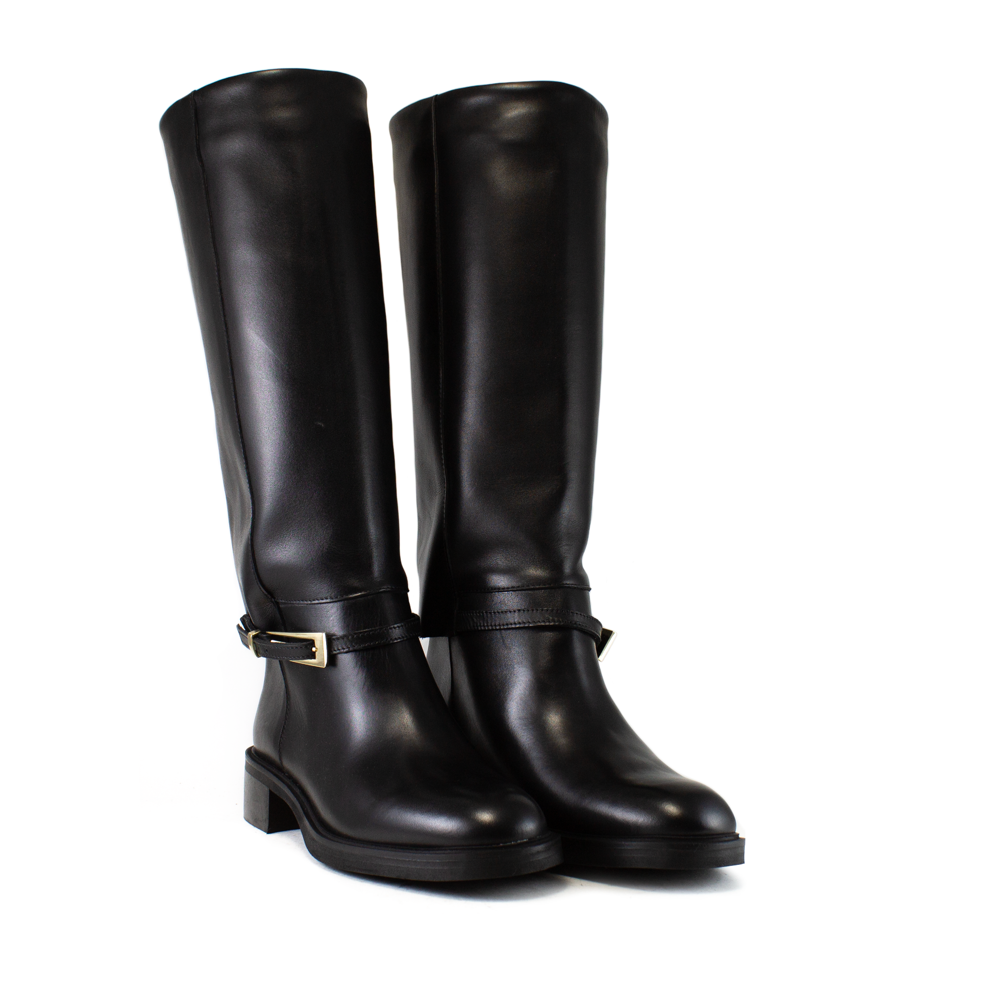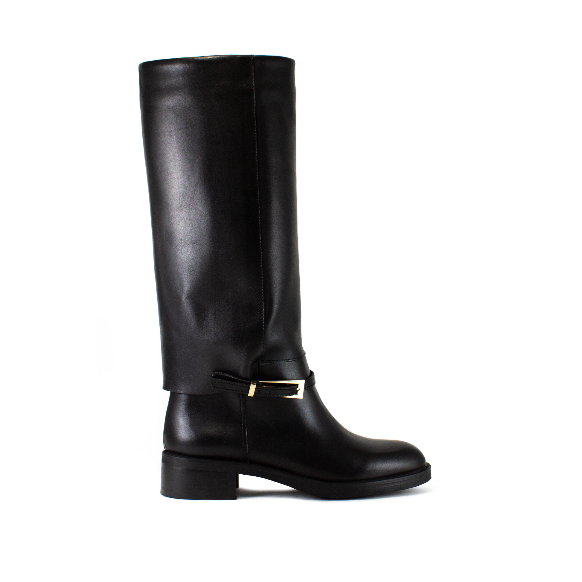 Questo modello interpreta alla perfezione il ritorno prepotente degli stivali alti in stile cavallerizzo, che dominano le passerelle e le tendenze street style di quest'autunno. Realizzati in vera pelle nera liscia e di altissima qualità, offrono una silhouette pulita e senza tempo.