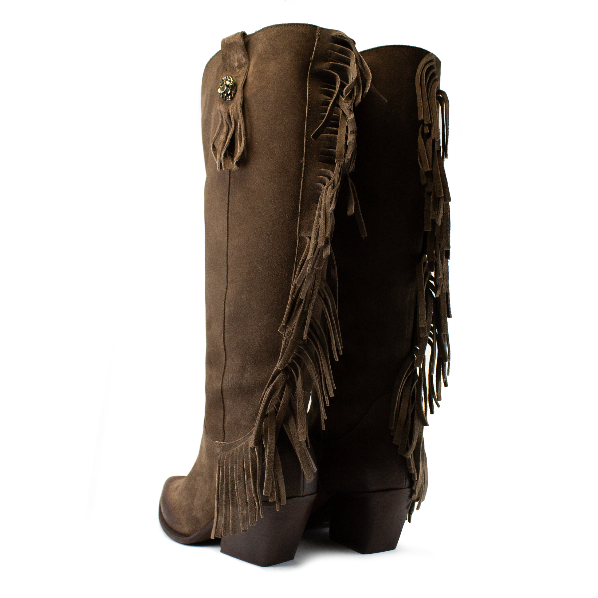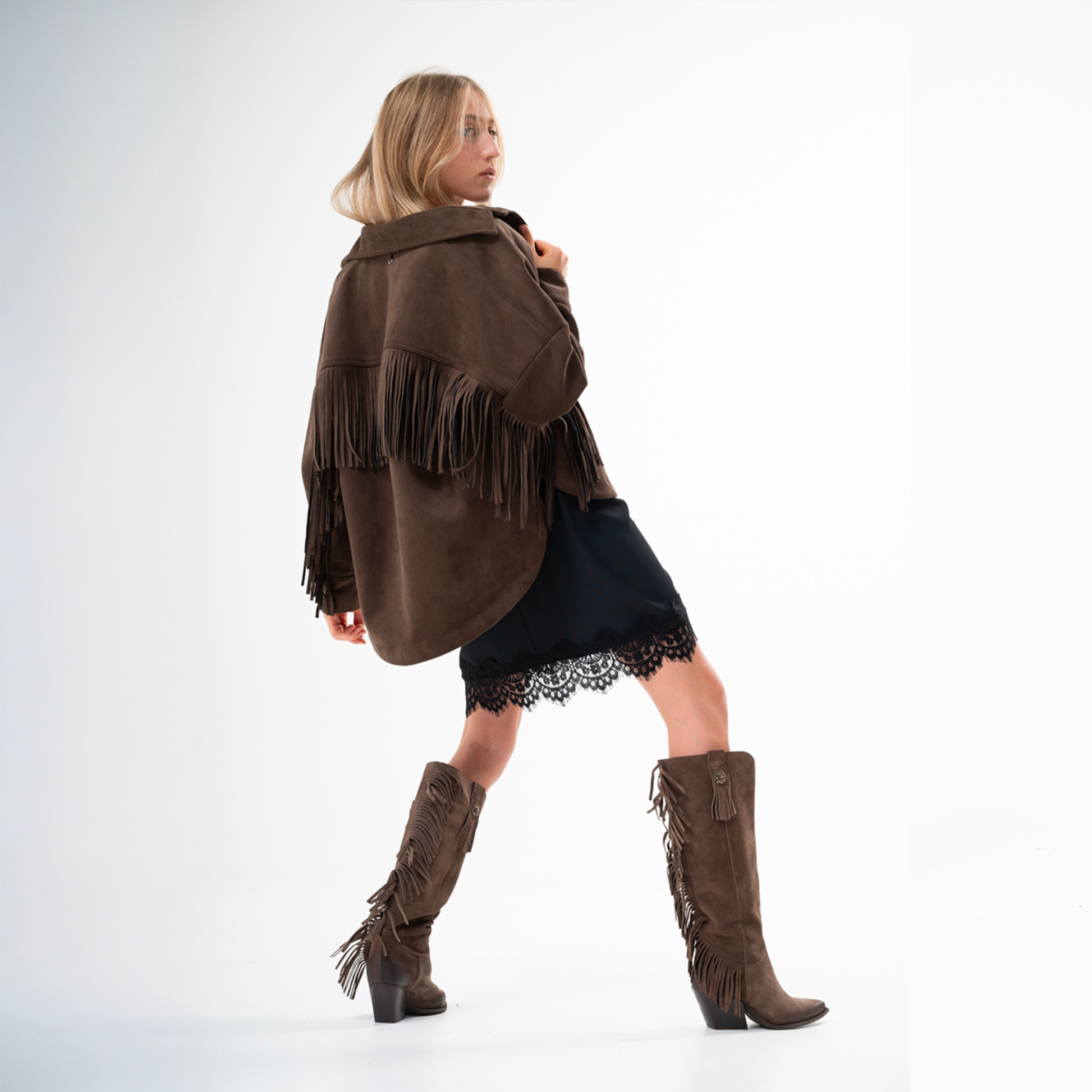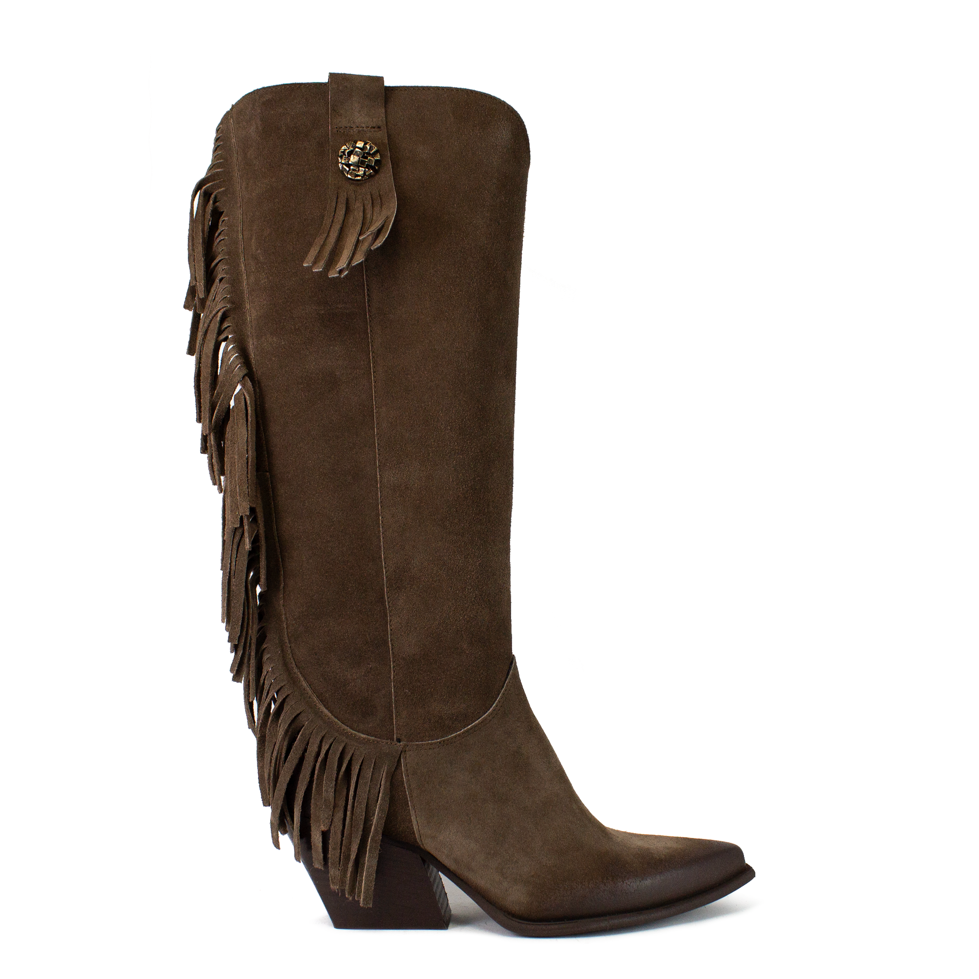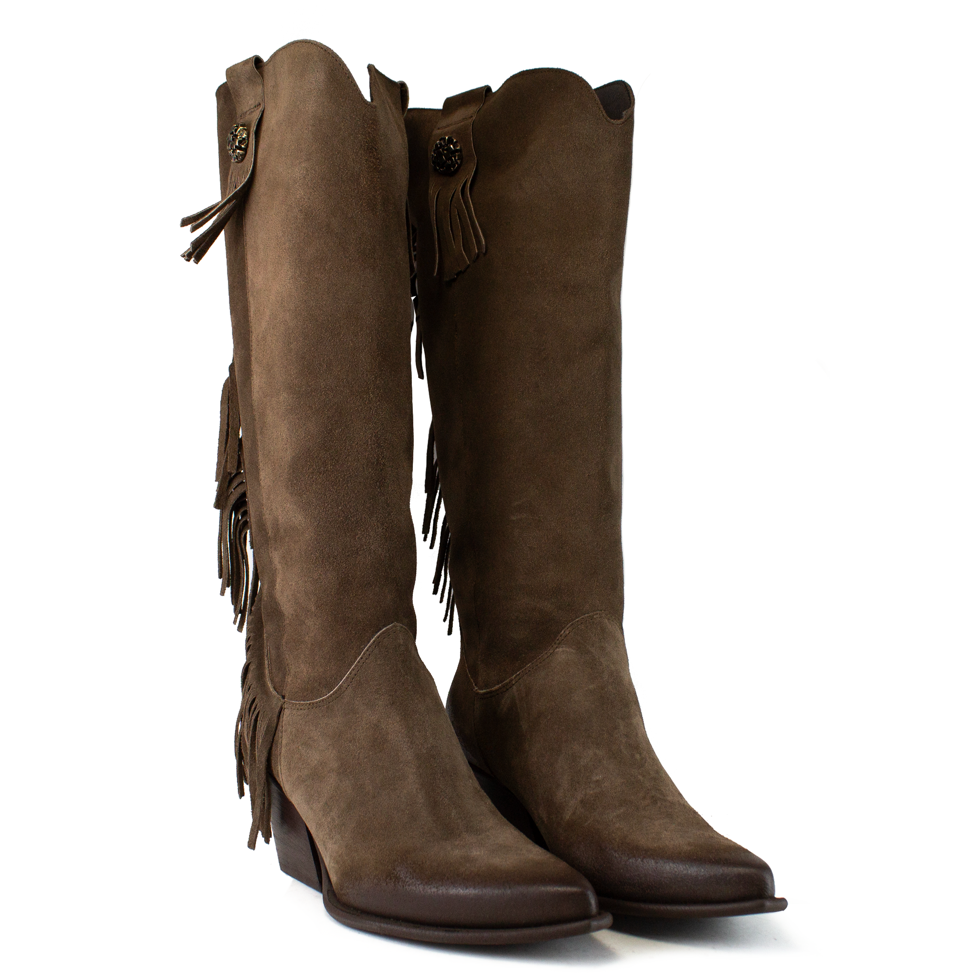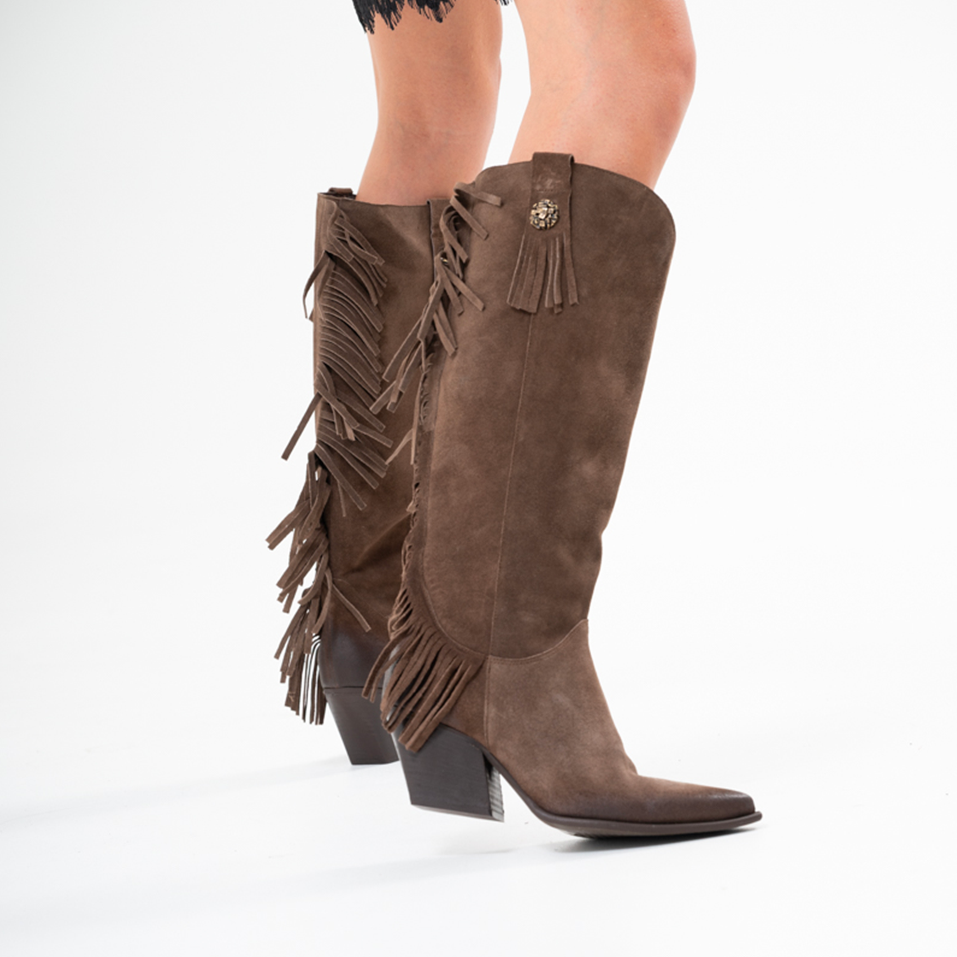 L'elemento statement è la cascata di frange in camoscio, lunghe e piene, che corrono lungo il gambale. Questo dettaglio dinamico conferisce un movimento ineguagliabile e un inconfondibile glamour cowboy-chic.