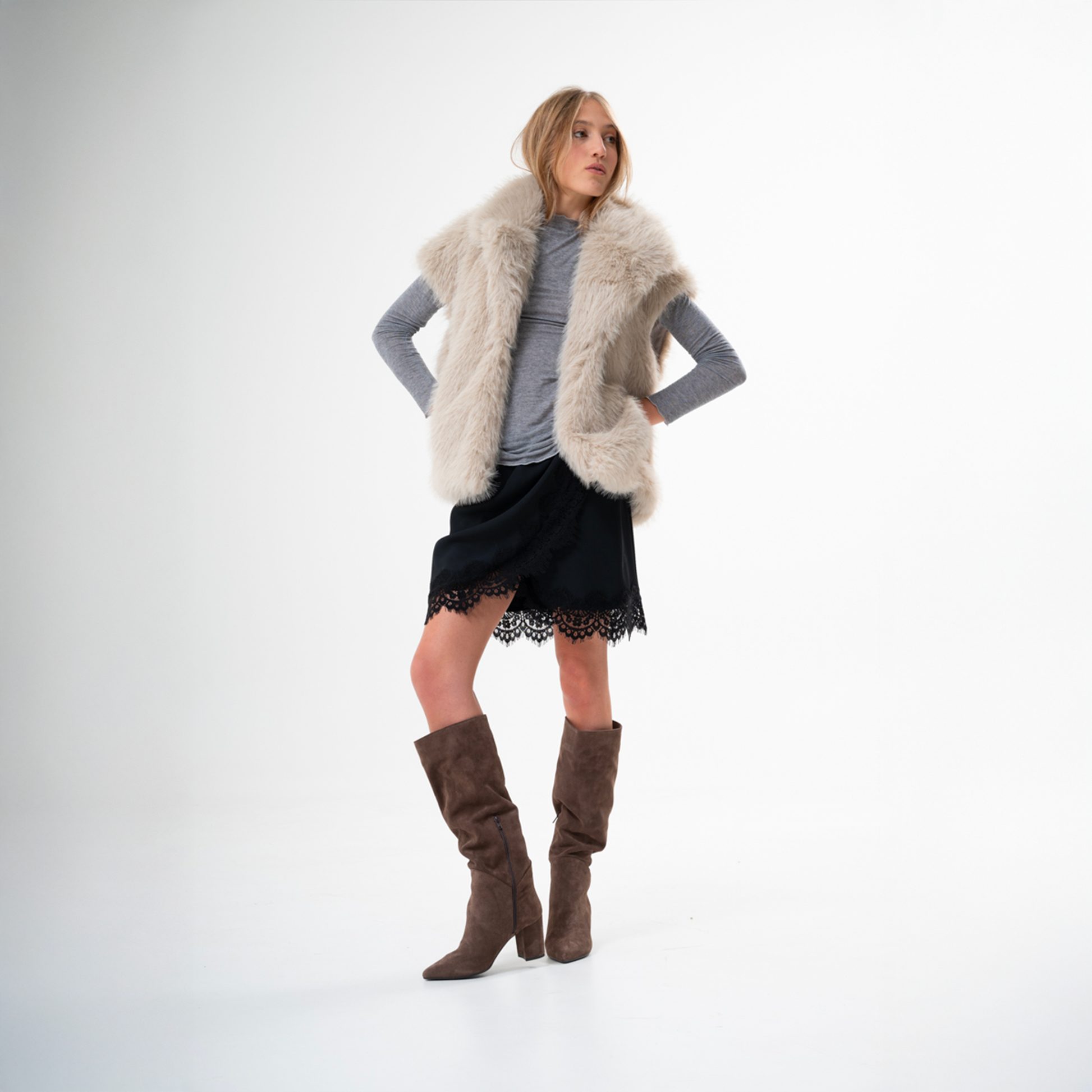 Scopri la perfetta armonia tra stile e comfort con i nostri stivali alti sotto il ginocchio, un'espressione di lusso e artigianato Made in Italy. Realizzati in sontuosa vera pelle scamosciata color taupe, questi stivali incarnano l'eleganza sofisticata e la tendenza del momento.