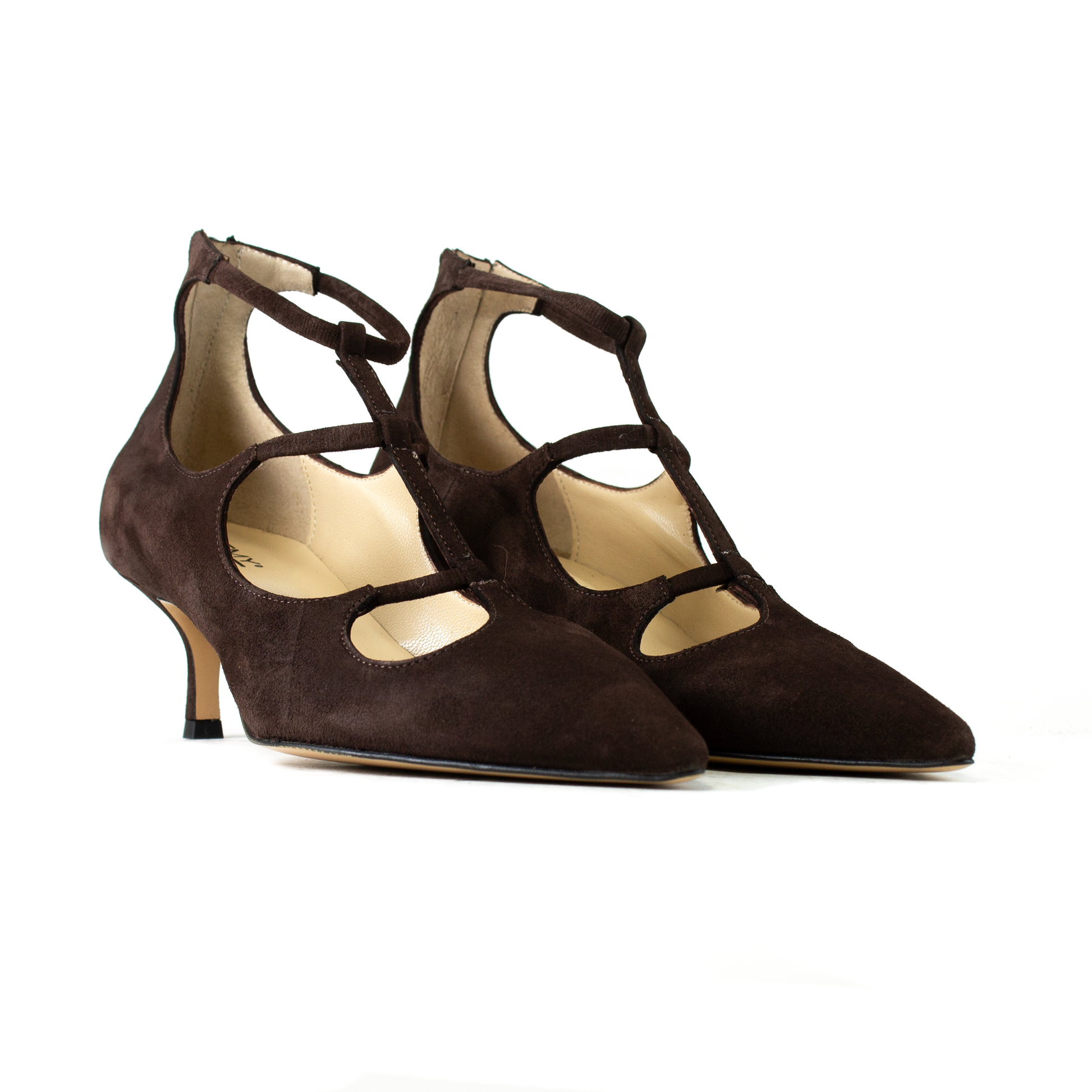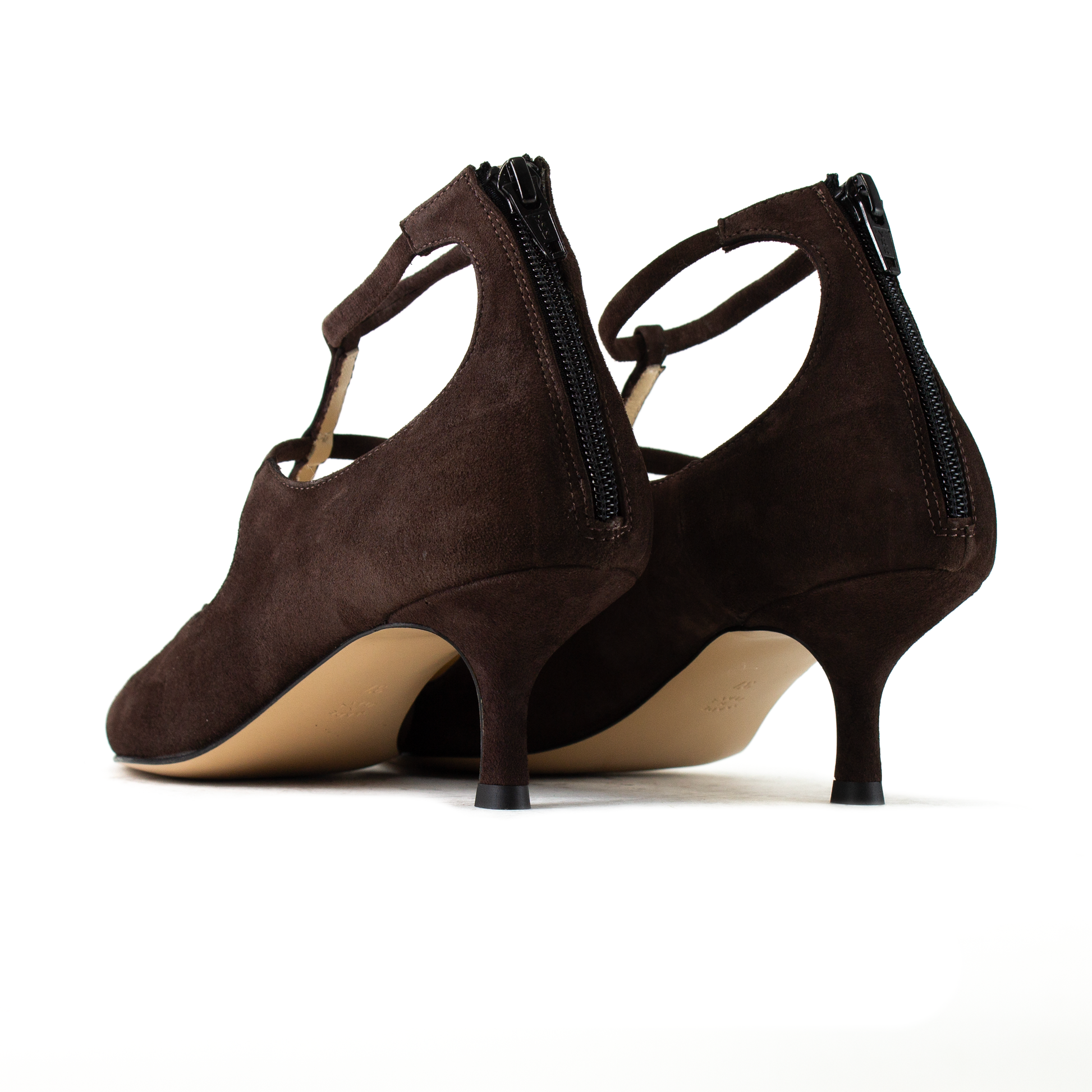 Riscopri il fascino senza tempo degli anni '20 e '30 con il nostro décolleté T-Bar in pelle scamosciata testa di moro, un capolavoro di sofisticazione firmato Made in Italy. Questa scarpa unisce la raffinatezza di una silhouette a punta sfilata al comfort e alla sicurezza di un design a laccetti e kitten heel.
