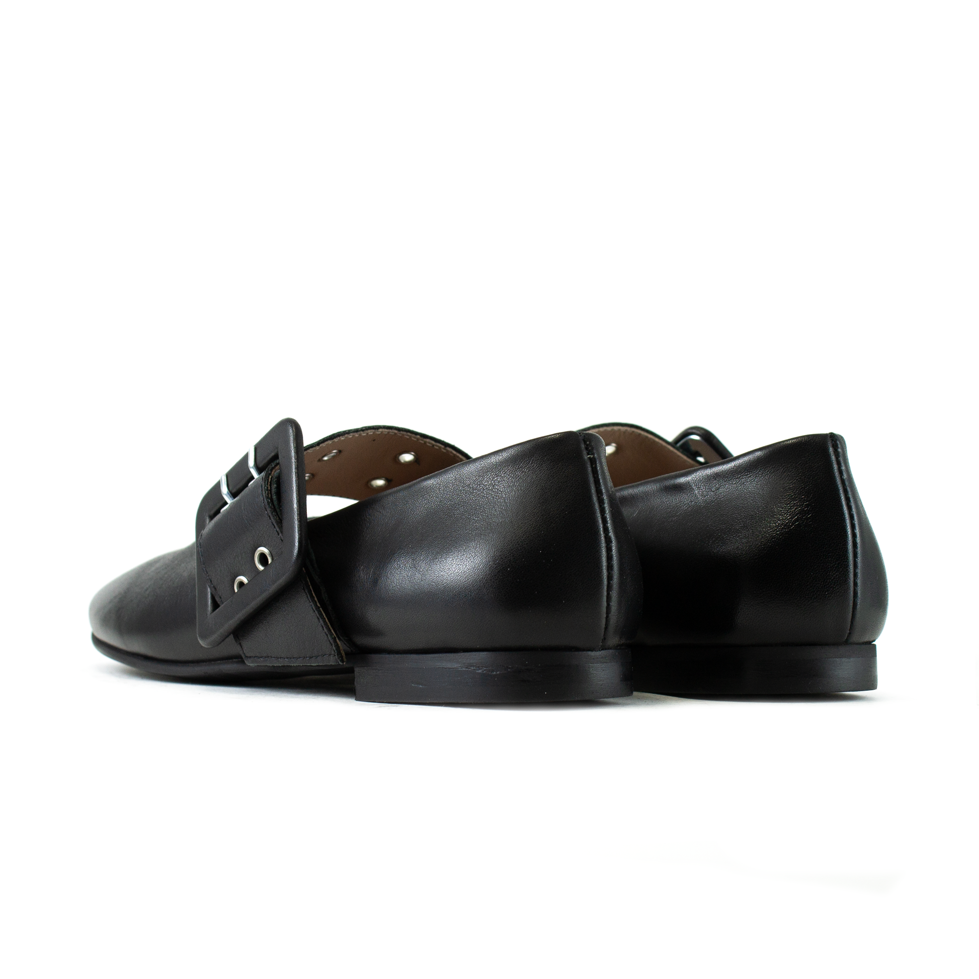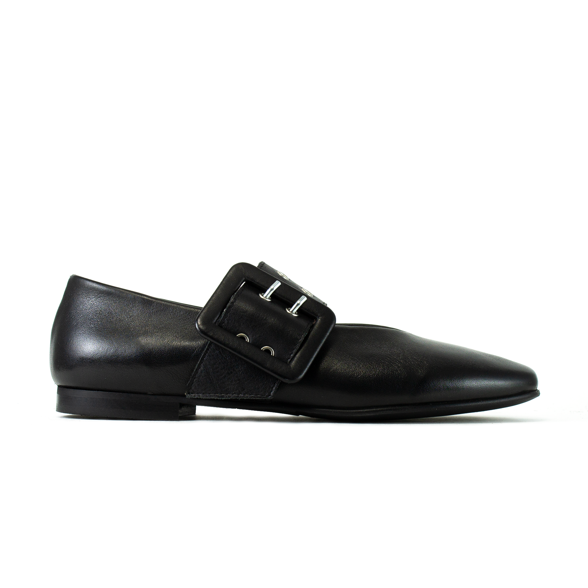 L'elemento di design che cattura immediatamente l'attenzione è la maxi fibbia squadrata che domina la parte centrale del piede. La fibbia è sorretta da una fascia cinturino ampio in pelle che avvolge elegantemente il collo del piede, aggiungendo struttura e personalità. Questa combinazione trasforma la classica ballerina in una calzatura statement di grande tendenza.