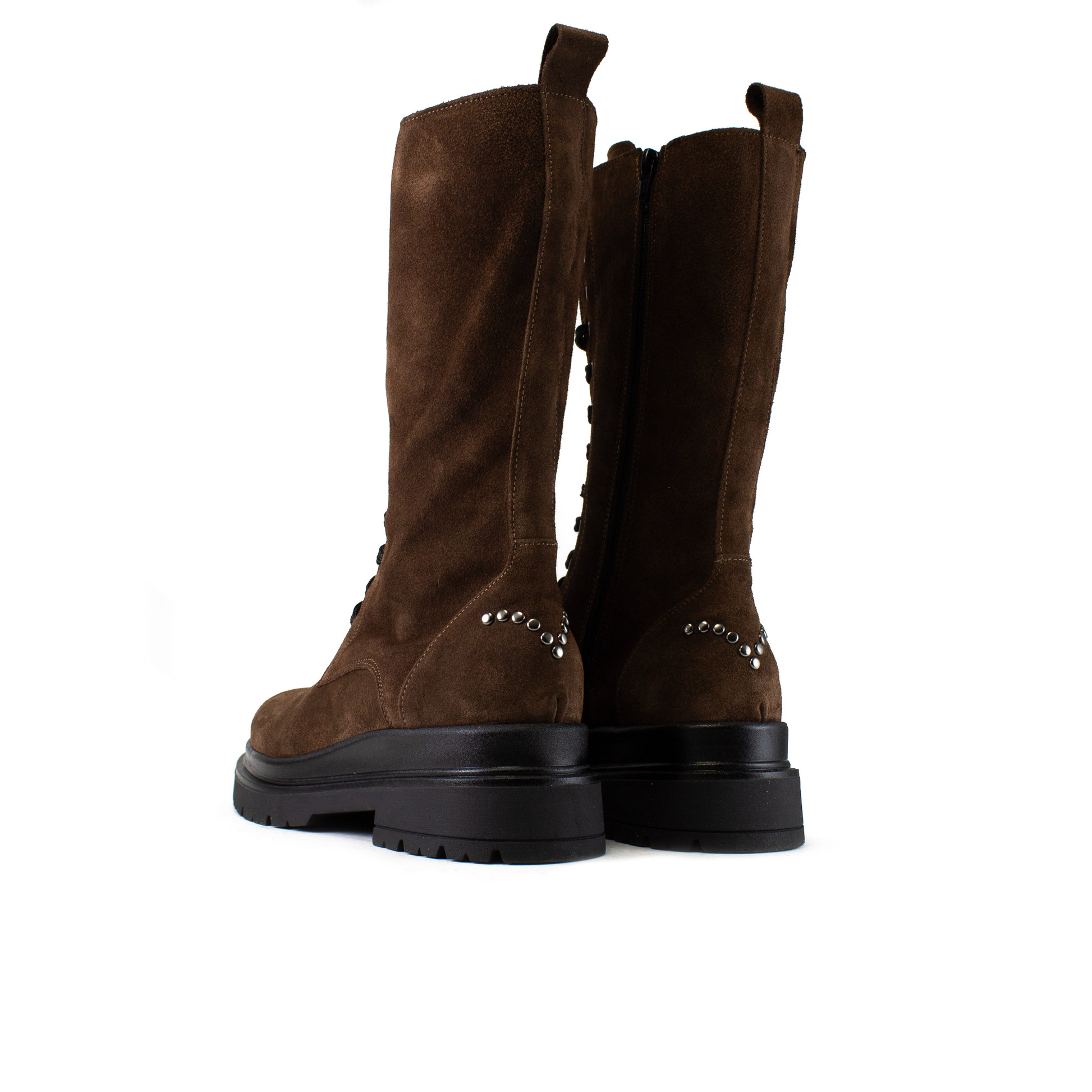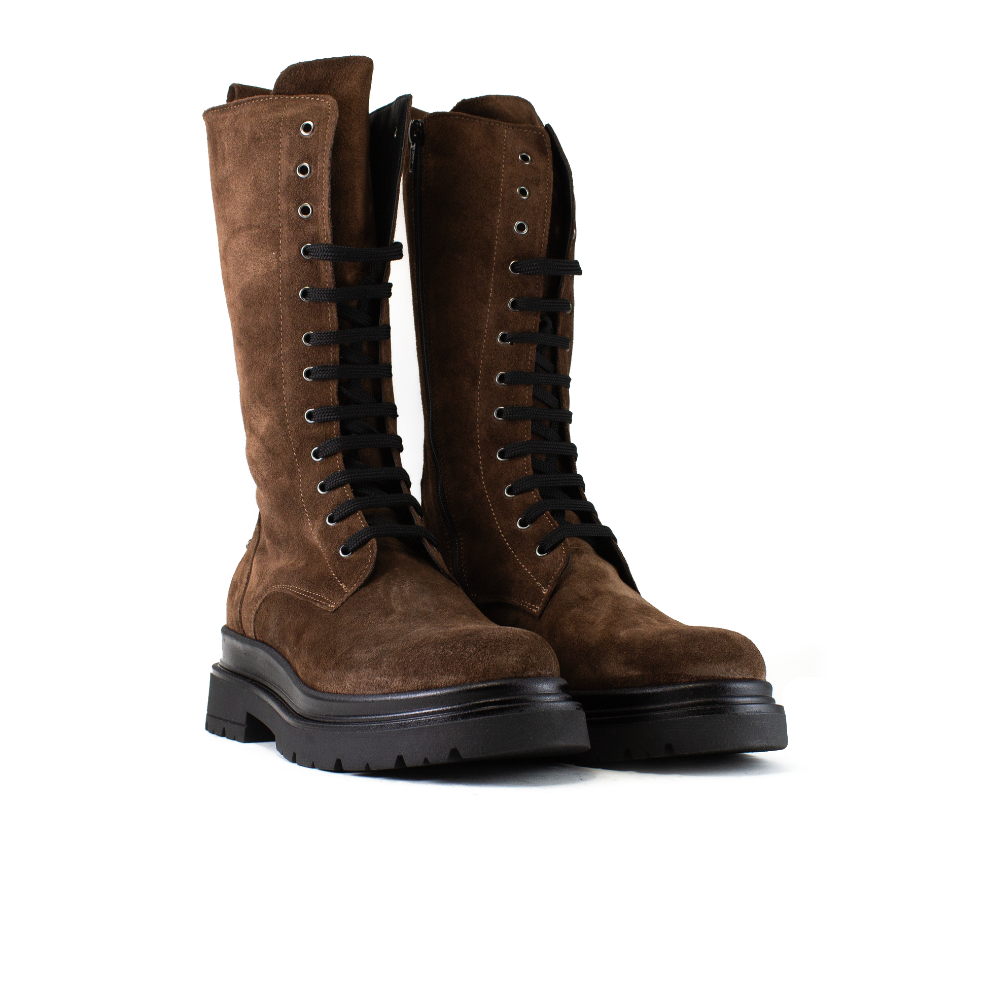 Aggiorna il tuo stile con i nostri anfibi alti in camoscio marrone, il must-have assoluto per l'Autunno/Inverno. Questo stivale unisce l'estetica robusta del combat boot con la morbidezza e la raffinatezza della vera pelle scamosciata italiana.