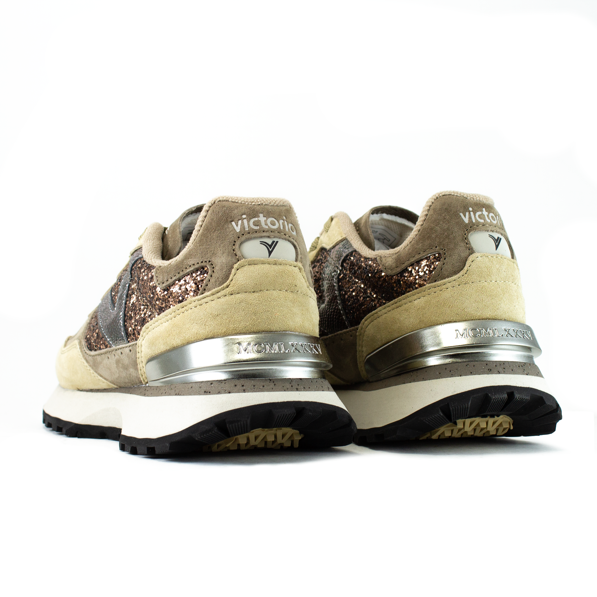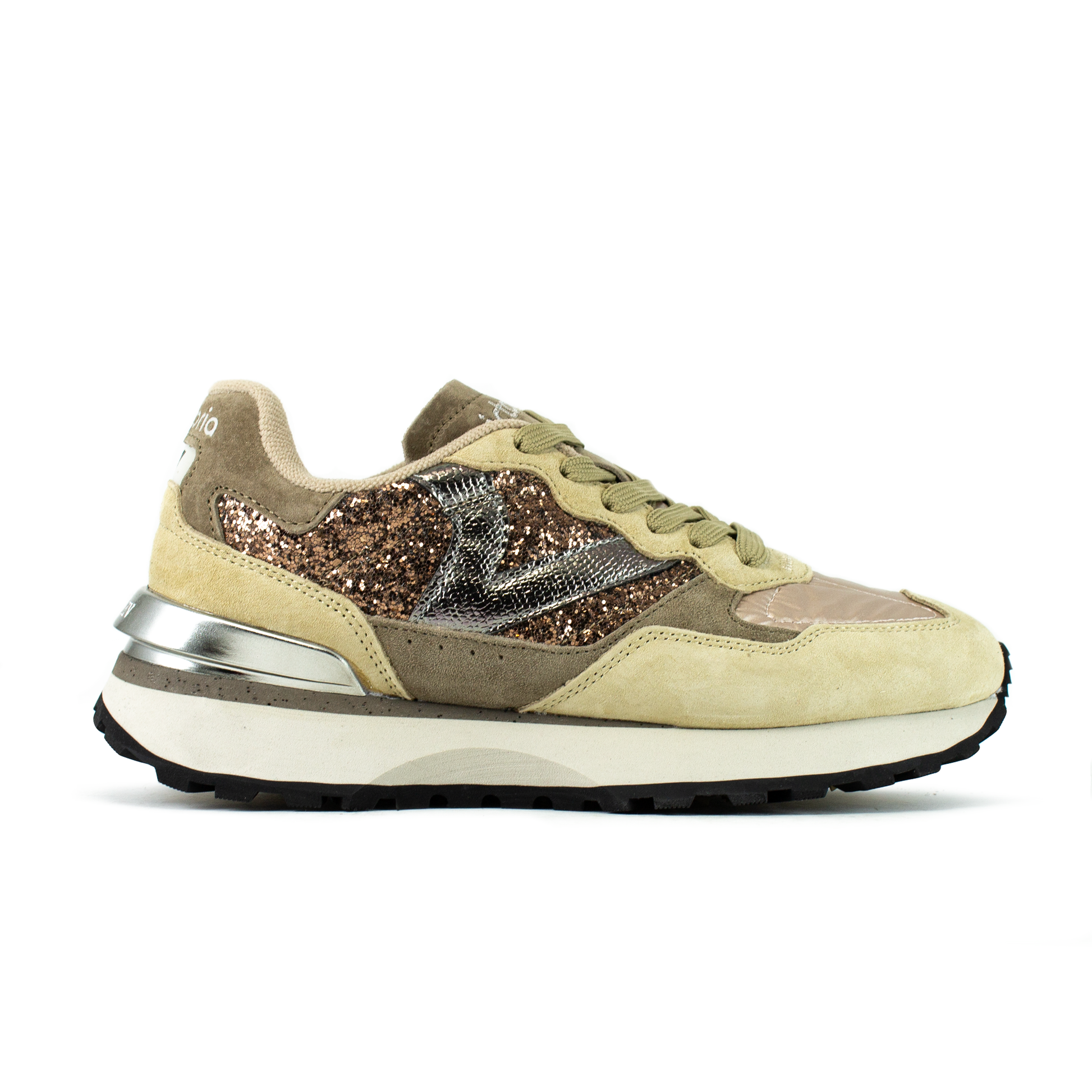 Le sneakers RUSH-GLAM da donna della collezione 1985 rappresentano la combinazione perfetta di stile urbano e comfort. Realizzate in glitter spesso metallizzato con inserti in crosta di pelle effetto velour e pelle effetto crack vintage. La suola con base in gomma garantisce un'aderenza ottimale grazie al design ergonomico, mentre la soletta con base in schiuma assicura un'ammortizzazione leggera per una camminata confortevole.