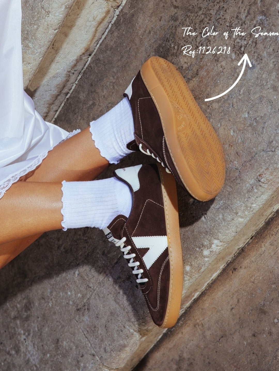 - Tomaia in pelle crosta marrone scuro effetto camoscio certificata LWG (Leather Working Group), che garantisce un processo di concia responsabile, con un uso efficiente di acqua, energia e una gestione sostenibile dei rifiuti, e materiali sintetici.