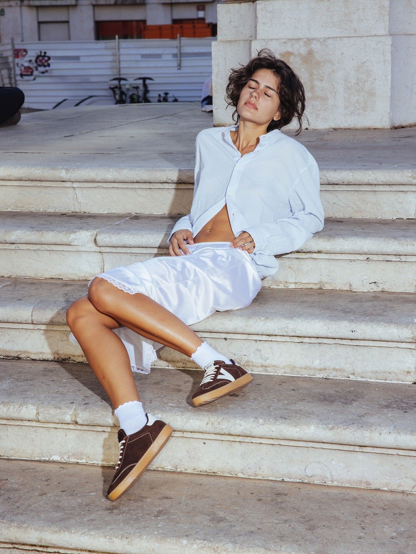 Sneakers bassa unisex con V laterale e inserto posteriore in materiale effetto pelle nero, con chiusura a lacci anch'essi neri. Cuciture tono su tono e nuovo taglio ciclista sulla punta. La suola traslucida color caramello aggiunge un tocco di stile retrò. Inoltre, includono una soletta più ergonomica, realizzata con materiali riciclati, che garantisce un comfort superiore a ogni passo.