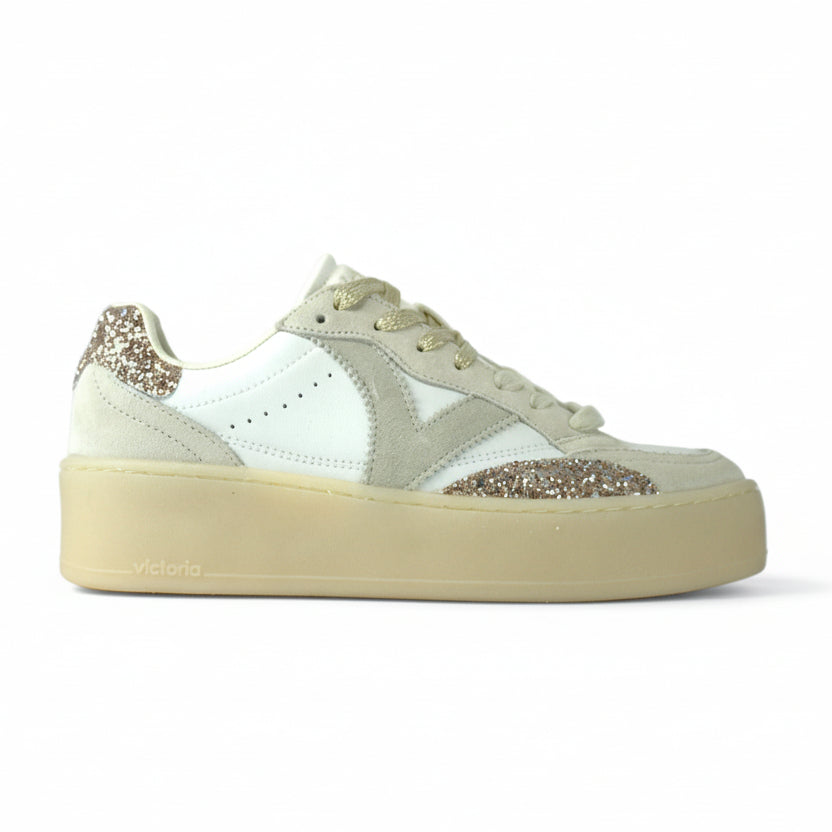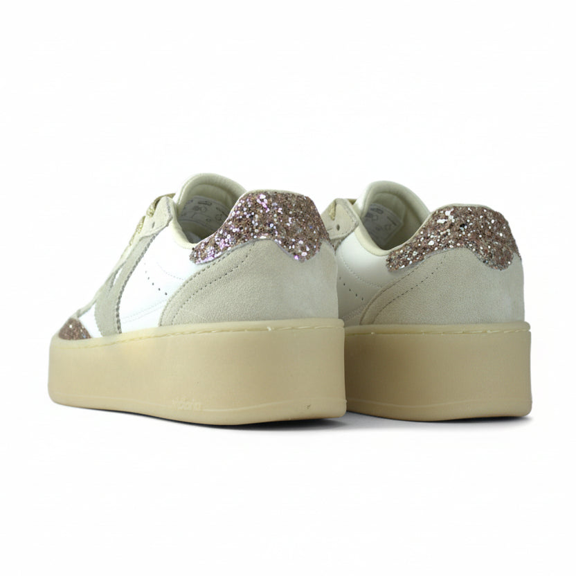 Sneakers con platform da donna realizzate in pelle bianca con sovrapposizioni in camoscio e glitter. Chiusura con lacci glitter platino. Punta traforata per favorire la traspirazione. Suola in TPR traslucido color caramello.