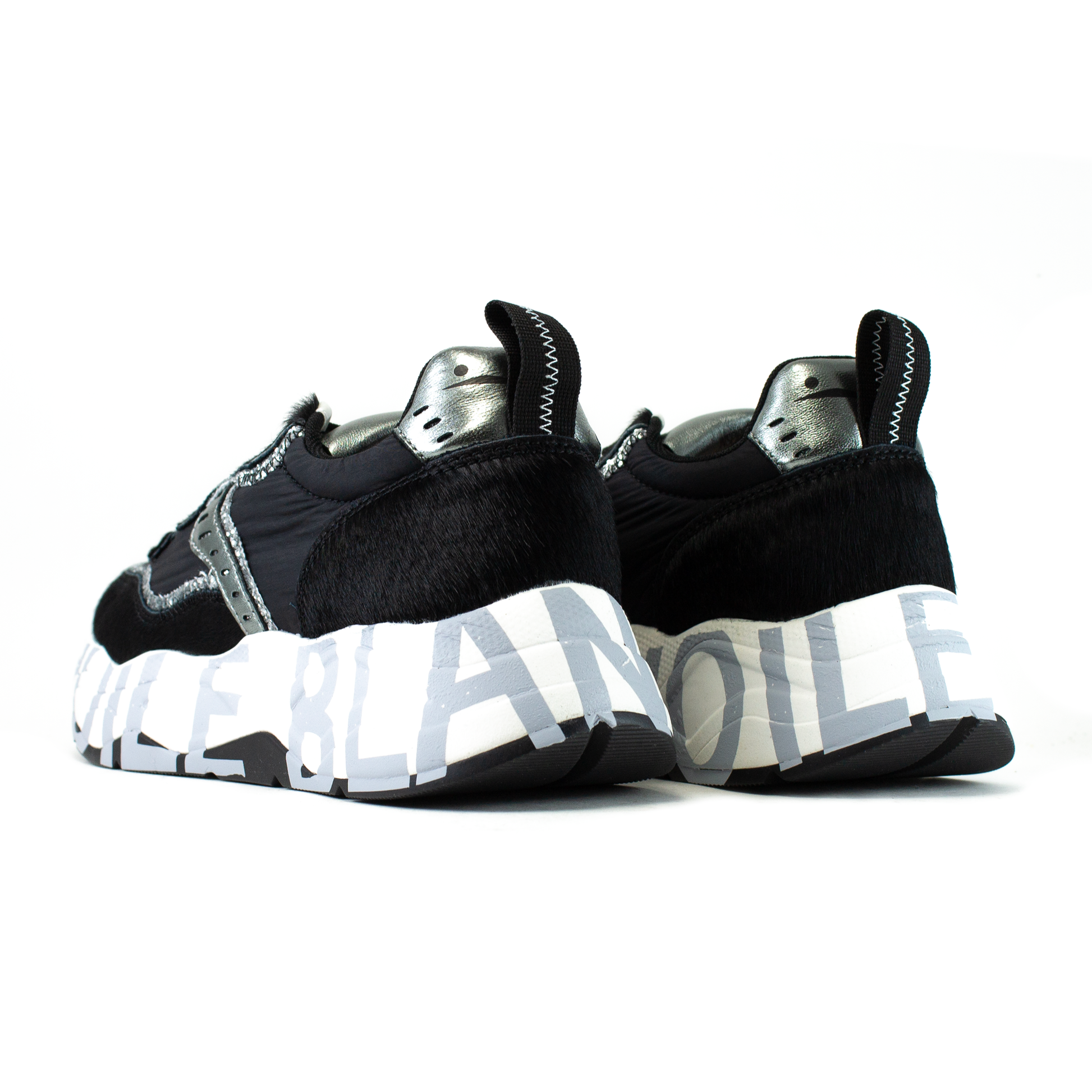 Sneaker in tnylon e cavallino, con dettagli in pelle laminata e glitter argento. Suola spessa in gomma ultra leggera, con bordo serigrafato.