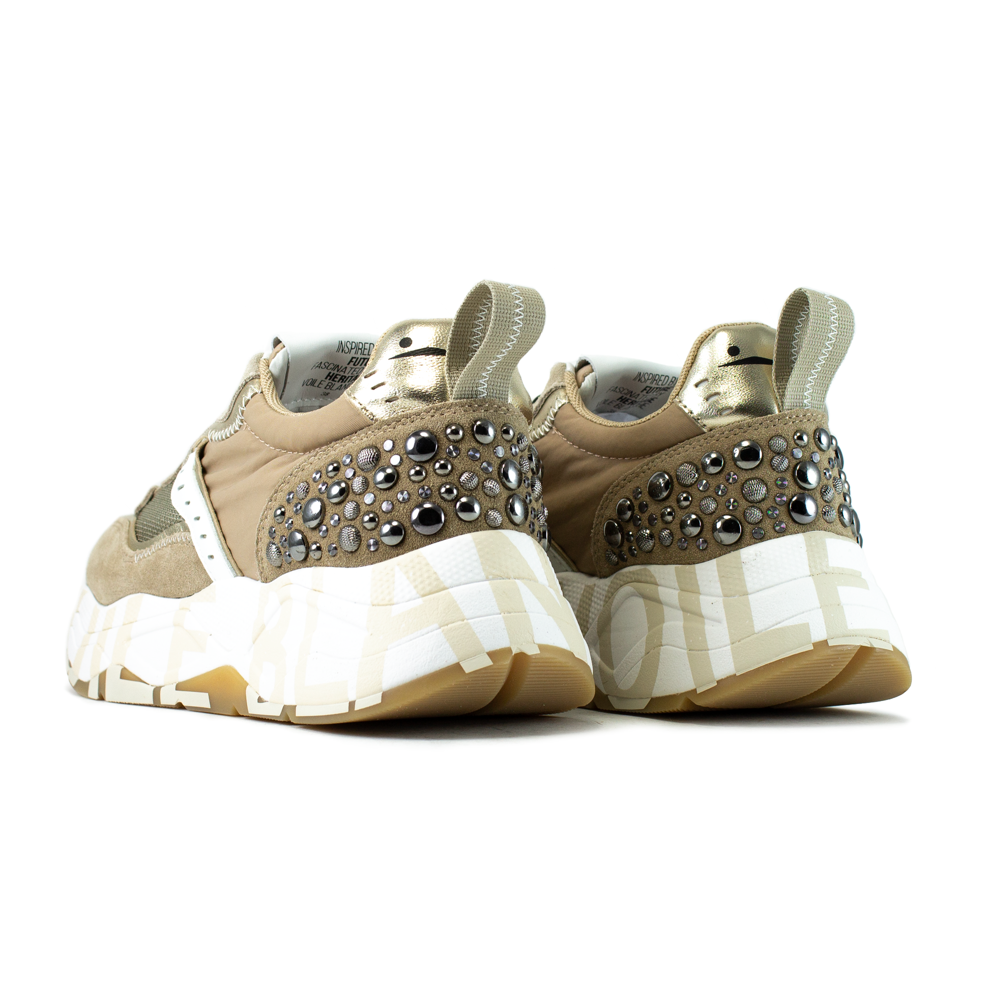 Sneaker in tessuto e suede, con dettagli in pelle bianca e argento. Suola spessa in gomma ultra leggera, con bordo serigrafato. Tutta l'eleganza dei toni neutri, in una sneaker che parla il linguaggio della moda. Il mix di borchie di dimensioni e stile diversi sul retro donano un tocco rock.